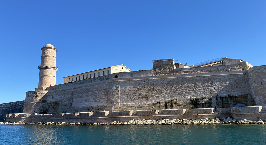 Skirting the harbor, I arrived at Fort Saint-Jean, perched on the headland to the right. This imposing fortress, with its limestone walls glowing in the morning light, was once a vital part of Marseille’s medieval defense system, guarding the entrance to the port. Today, it forms part of the city’s historical museum complex and is open to the public for free—a rare and generous invitation into the past.