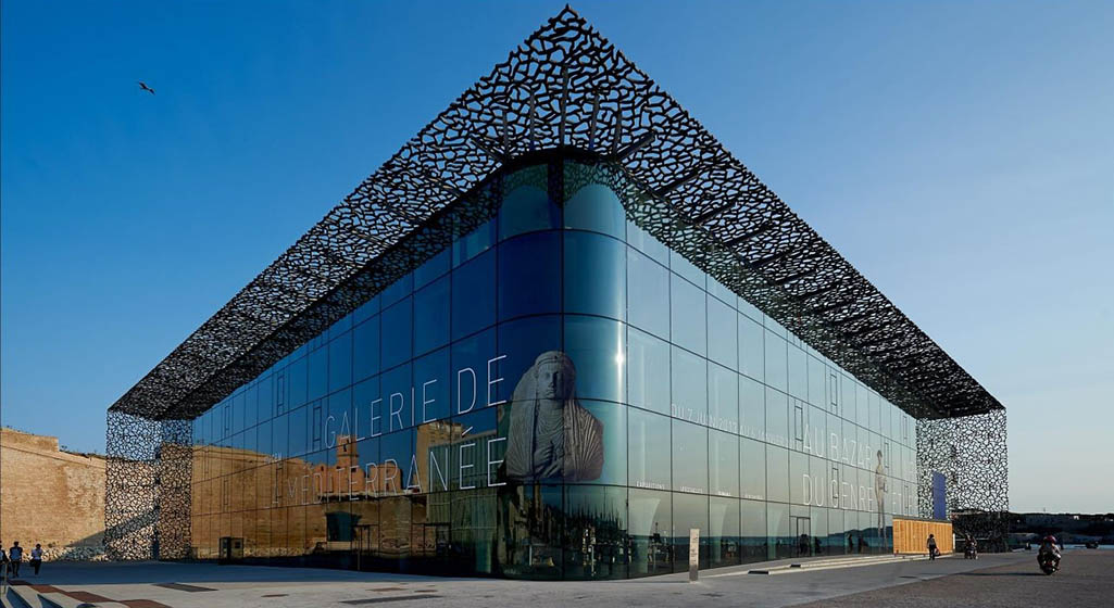 Right next to the fort stands one of Marseille’s most modern and striking buildings—the Museum of European and Mediterranean Civilizations (MuCEM). Its structure, built from black steel mesh and shimmering glass, resembles a porous Mediterranean rock hovering over the sea. This intricate façade filters sunlight like lace, casting moving shadows on the plaza below. The museum rises boldly at the water’s edge, its design a dramatic contrast to the old stone walls of Fort Saint-Jean, just meters away.